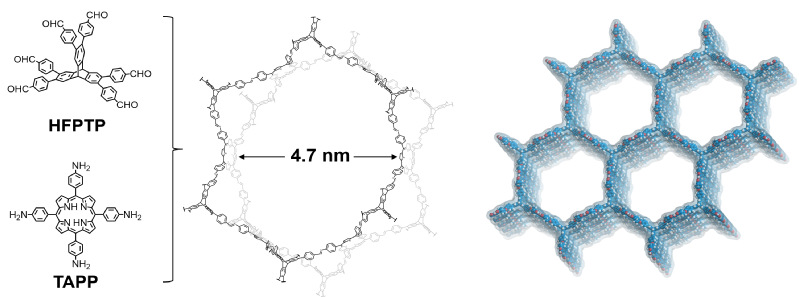 本研究成功构筑了一种具有超大孔径(47 Å)和超低密度(0.106 g/cm3)的3D非互穿stp拓扑结构共价有机框架材料——TUS-64。该材料由D3h对称结构的三蝶烯单体与D4h对称结构的卟啉单体聚合形成,突破了3D COF合成中因框架互穿导致孔道堵塞和结构塌陷的难题。